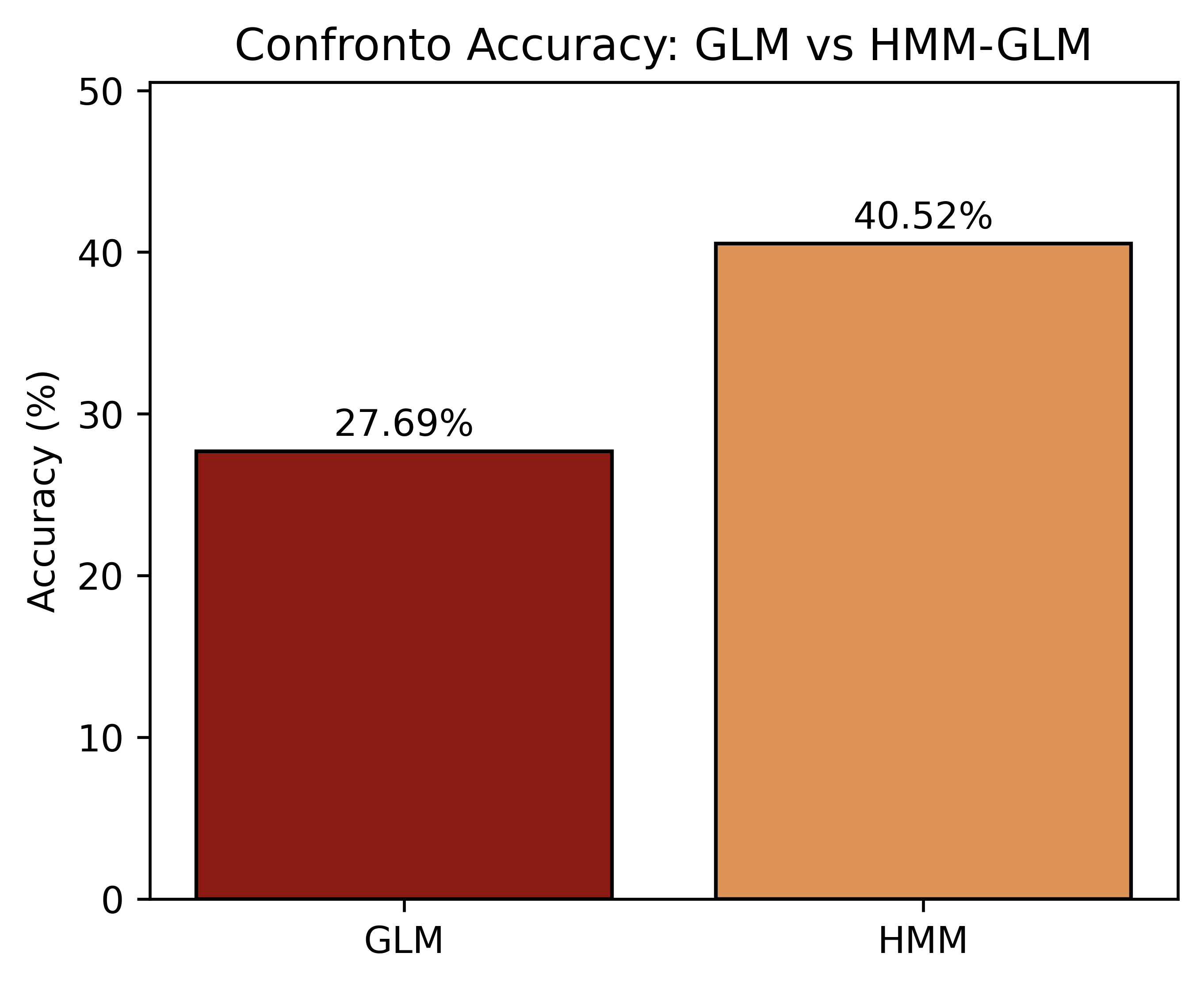 L’HMM-GLM ottiene un’accuracy superiore al GLM (42.24% vs 27.48%; vedi figura Figura 3.7), ottenendo dunque una predizione migliore basata solamente sul numero di unità predette correttamente. Tuttavia, sul livello medio, il GLM è più vicino all’osservato mentre l’HMM-GLM tende a sottostimare.