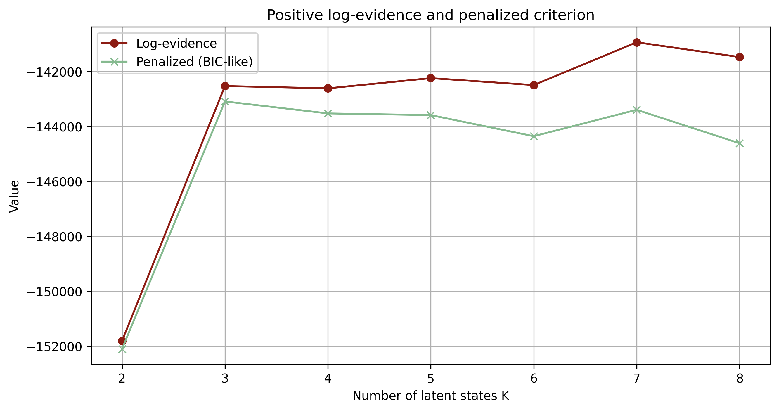 Il numero di stati latenti è stato fissato a \(K=3\) per ragioni di interpretabilità e stabilità numerica. Inoltre, la scelta è stata giustificata anche dal Bayesian Information Criterion, BIC Wit, Heuvel, e Romeyn (2012). Il BIC è un criterio per la selezione del modello statistico da usare basato sulla funzione di verosimiglianza ma che viene penalizzato all’aumentare del numero di parametri e dalla scarsezza del numero di osservazioni ed è definito come segue: \[ \text{BIC} = k\ln(n) - 2\ln(\widehat L) \tag{3.12}\]