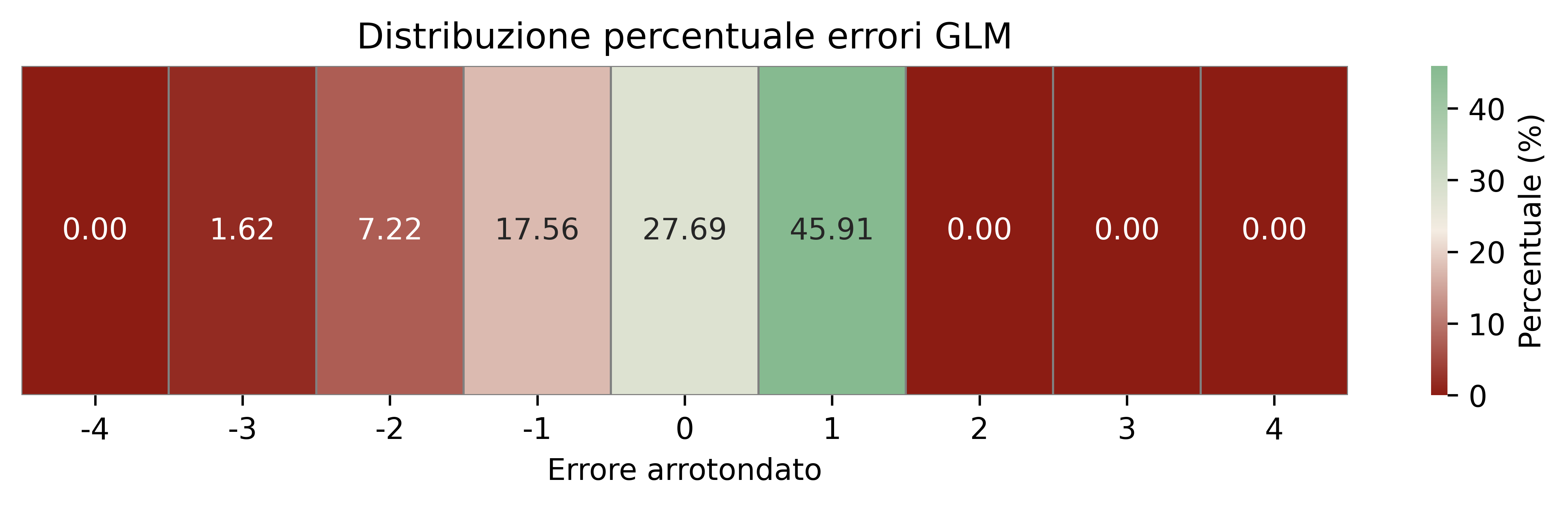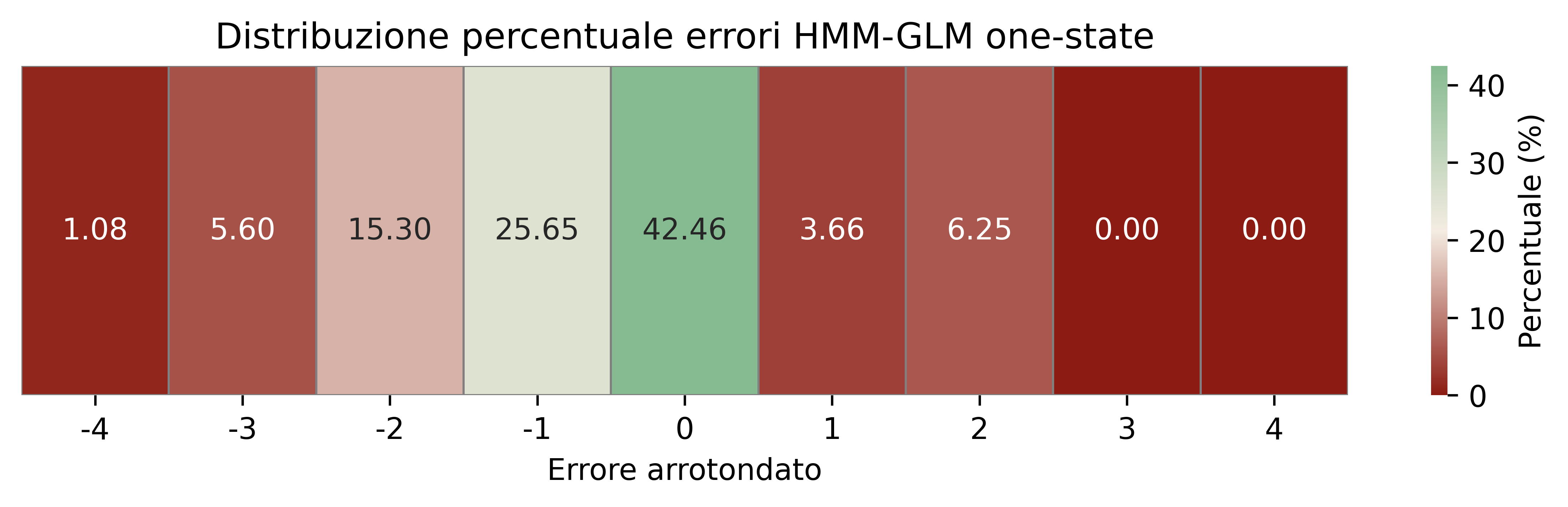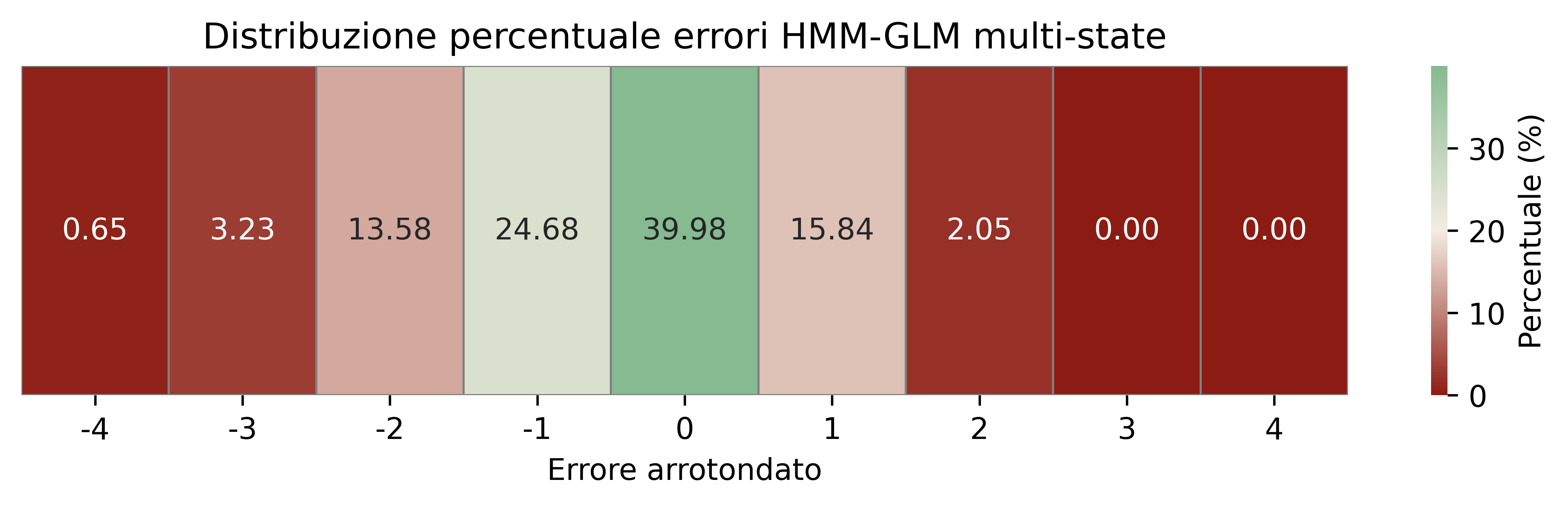 Le mappe di calore in Figura 3.8 mostrano la distribuzione percentuale degli errori arrotondati \((\hat y - y)\). Per l’HMM-GLM predetto sul solo stato più probabile (Figura 3.8 (c)) emerge una forte massa in 0 (predizione esatta) e, a seguire, in -1 e -2 (sottostima), mostrando una forte assimetria degli errori; per il modello HMM-GLM che, invece, considera tutti possibili stati futuri e calcola una predizione pesata su di essi, si ottiene una accuracy leggermente minore ma una simmetria maggiore e l’intervallo \([-1, 1]\) contiene all’incirca l’80% delle predizioni; per il GLM (Figura 3.8 (a)) la maggior parte degli errori è tra -1 e 1 con dispersione più simmetrica. Ciò è coerente con il fatto che l’HMM-GLM “aggancia” meglio le categorie discrete grazie allo stato selezionato, mentre il GLM media meglio il livello.