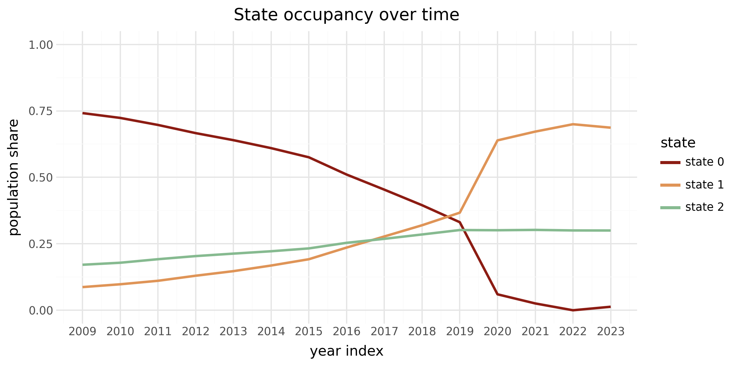Con l’algoritmo appena descritto, andiamo a calcolare per ogni donatore nel nostro dataset la sue serie temporale attesa di stati latenti e rappresentiamo in un grafico (vedi Figura 3.5) la loro distribuzione lungo gli anni. I risultati mostrano come lo stato 2, ovvero dei donatori frequenti è abbastanza stabile e in leggero aumento. Mentre, si nota come durante la pandemia ci sia stato un notevole spostamento dallo stato 0 (non donatore) allo stato 1 (donatore saltuario). Ciò è stato confermato nella sezione precedente (Sezione 3.3.3) dove attraverso il grafico dei coefficenti della matrice di transizione \(W_A\) si osservava (vedi Figura 3.4) come la probabilità di passare dallo stato 0 a uno stato superiore fosse molto maggiore che in un periodo in assenza della pandemia.