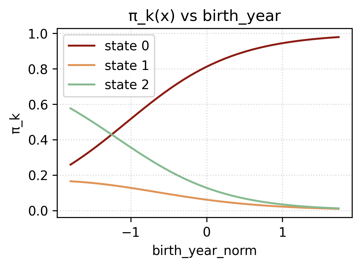Il secondo dataset sarà usato per calcolare \(\pi = Pr(Z_{n,1} \mid X_{n,1}^{\pi})\), ovvero la probabilità dell’individuo \(n\) di iniziare nello stato \(k\), date le covariate \(X_{n,1}^{\pi}\), dove \(X_{n,1}^{\pi}\) è una matrice di dimensione \(N, P_\pi\) con \(p_\pi\) il numero di covariate utilizzate.