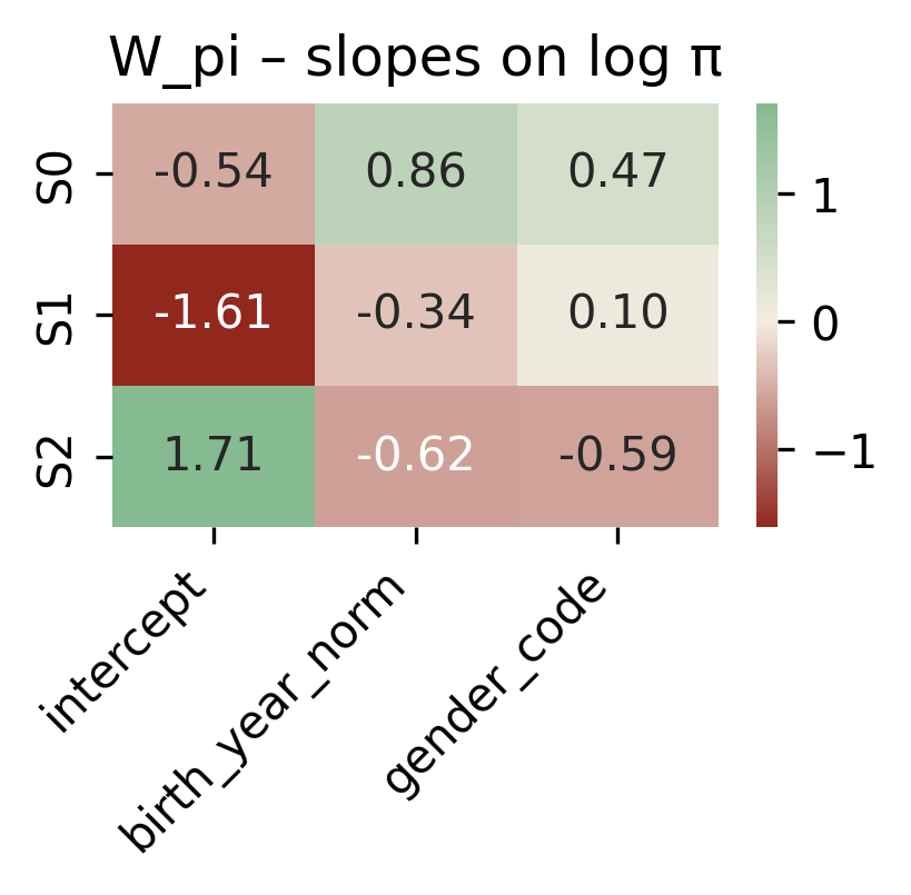 Osservando i coefficienti delle probabilità inziali \(W_\pi\), si nota come la probabilità che un donatore inizi dallo stato 2 aumenti al crescere dell’anno di nascita, mentre decresce la probabilità di inziare dallo stato 0 (Figura 3.3 (b)). Per il genere, invece, sarà più probabile che una donatrice inizi dallo stato 0 che dallo stato 2, mentre per lo stato 1 l’effetto è meno accentuato. Come visto nel capitolo introduttivo, nelle analisi preliminari (vedi Sezione 1.2.2), osservando la tabella delle donazioni per genere ed età (vedi Tabella 1.3) si osservava come ci fosse un forte incremento di donazioni da parte delle donatrici più giovani negli ultimi anni. Ciò giustificherebbe i coefficienti presenti in Figura 3.3 (a).