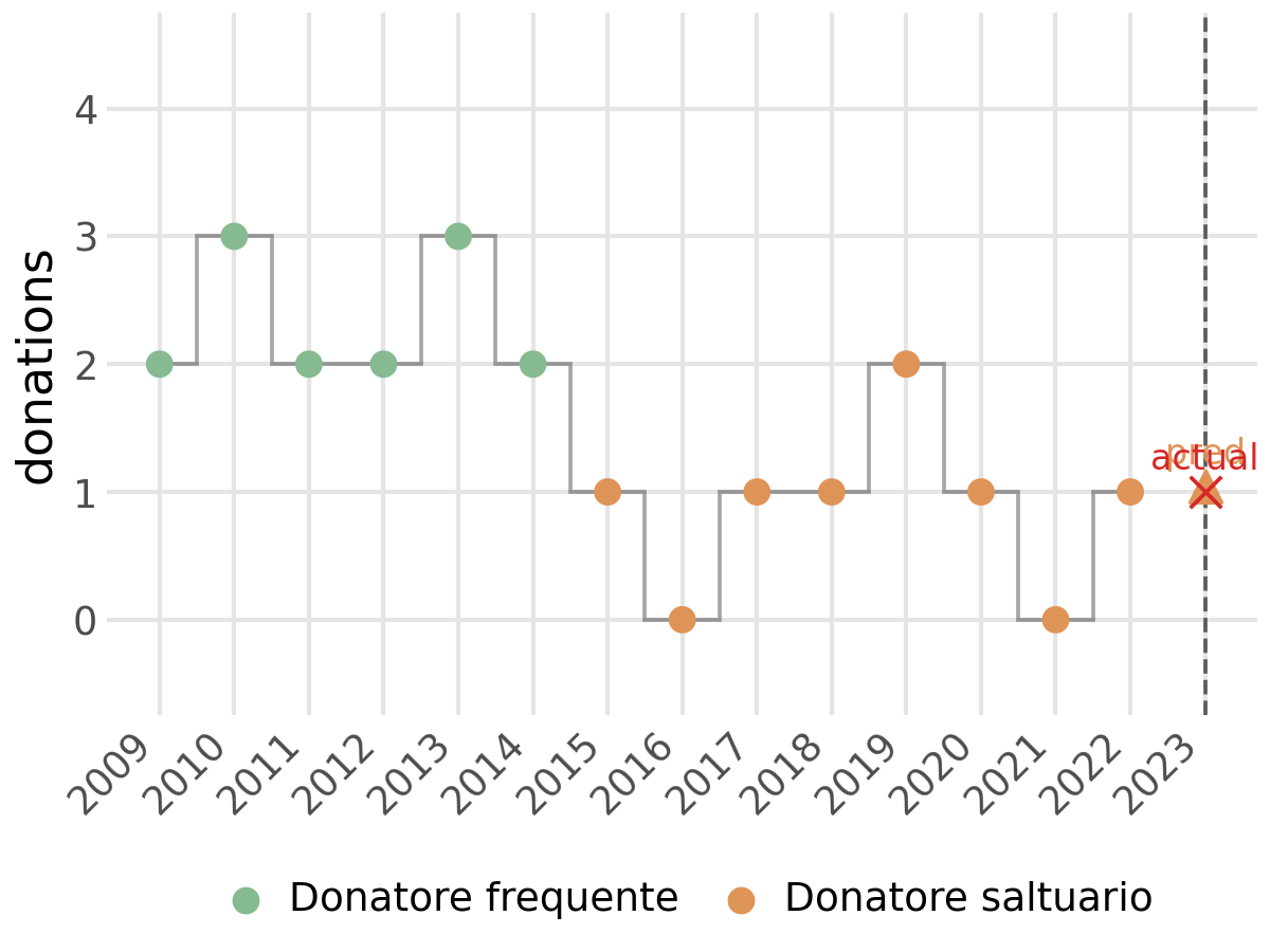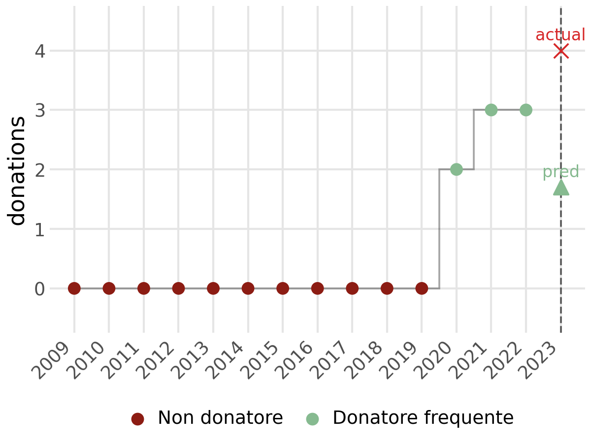 In Figura 3.6 si possono vedere degli esempi su donatori che seguono traiettorie ben distinte tra loro. Il modello è capace di seguire le loro traiettorie e adattarsi in eventuali cambi di comportamento del donatore. In Figura 3.6 (d), il modello è dormiente fino alla sua prima donazione per poi assegnare al donatore lo stato 2, ovvero di donatore frequente. In Figura 3.6 (a), invece, il donatore inzia da uno stato 2 per poi passare nel tempo a un calo nel numero di donazioni annue, ed il suo stato mutua da 2 a 1. Alla fine di ciascun grafico è presente il numero di donazioni predetto dal modello e il numero di donazioni effettivamente effettuate all’anno \(T+1\). Il colore del triangolo rappresenta lo stato più probabile all’anno successivo.