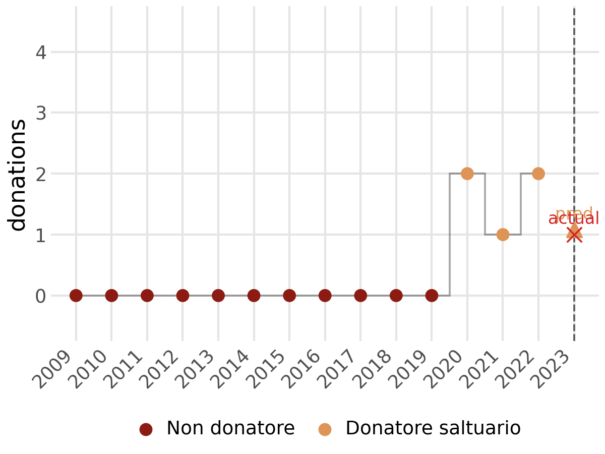 Durante la pandemia da coronavirus SARS-CoV-2 la propensione a donare e le sue motivazioni sono cambiate molto. Riteniamo quindi di dovere aggiungere quest’informazione al modello e manipolare la serie storica in questo momento storico in modo a se stante. Infatti grazie all’introduzione di questa covariate si possono osservare in quegli anni, un profondo cambiamento del trend.