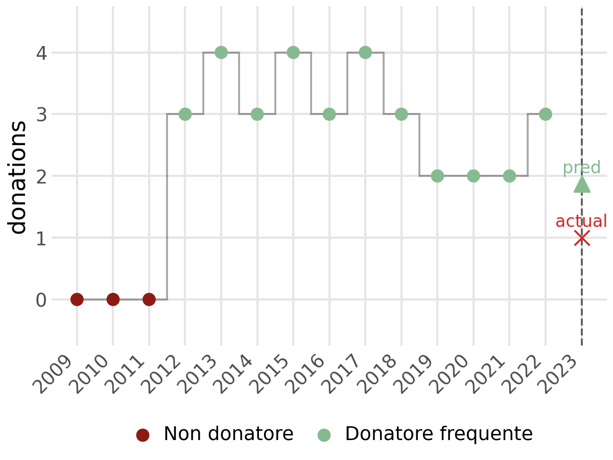 Data una serie di osservazioni, ovvero di donazioni e un set di informazioni demografiche sull’individuo, il nostro scopo sarà quelllo di prevedere il numero di donazioni all’anno successivo, dunque il suo stato latente al tempo \(T+1\).
