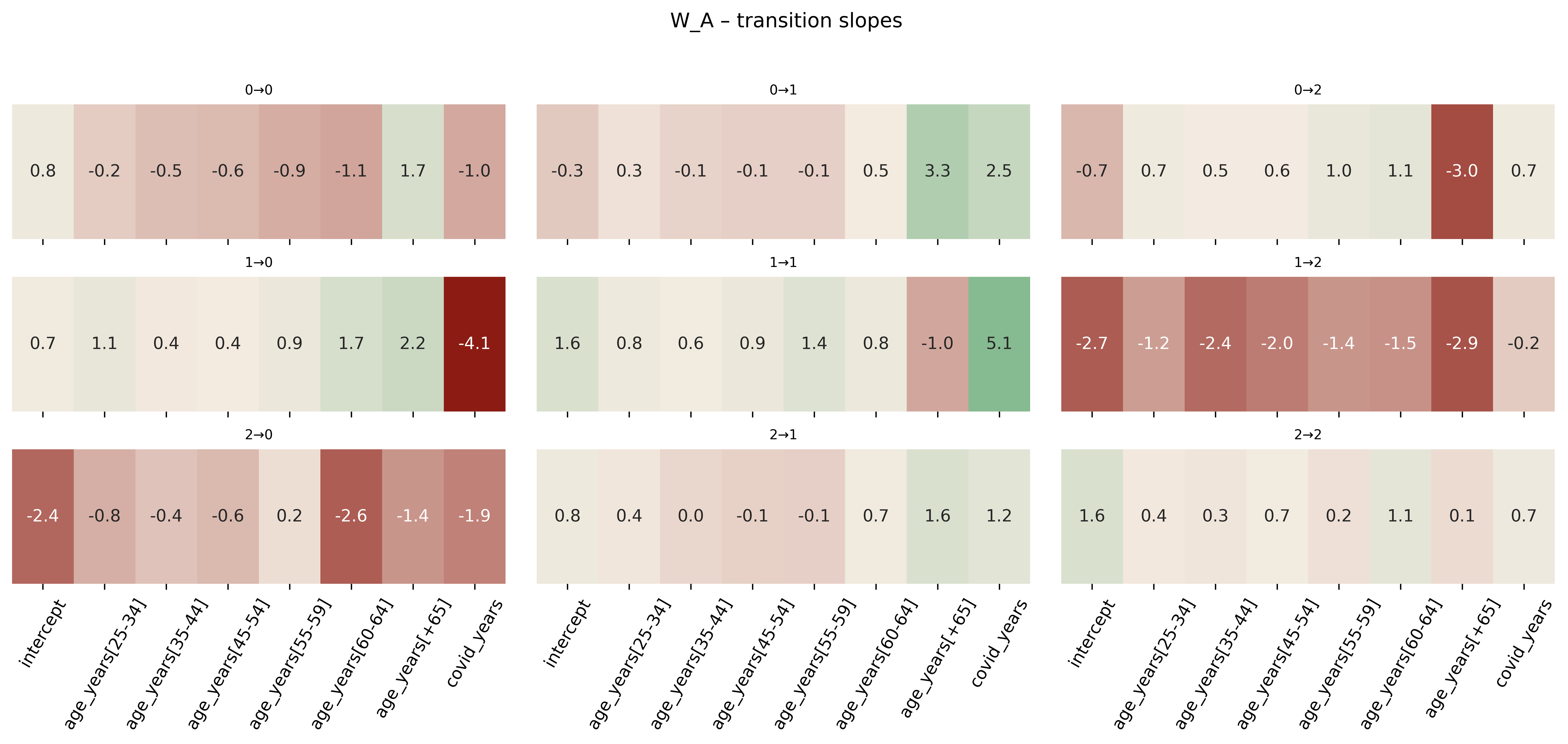 Per quanto riguarda l’effetto covid, durante gli anni della pandemia la probabilità delle transizioni \(0 \to 0\), \(1 \to 0\) e \(2 \to 0\) erano minori, invece erano maggiori per le transizioni \(0 \to 1\) e \(1 \to 1\). Si osserva anche che molti donatori frequenti, in quel periodo, hanno ridotto il numero di donazioni (\(2 \to 1\)).